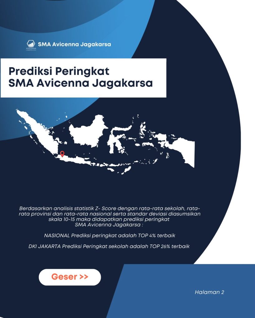 Berdasarkan analisi statistic Z-Score dengan rata-rata sekolah. Rata-rata provinsi dan rata-rata nasional serta standar deviasi diasumsikan skala 10-15 maka didapatkan peringkat SMA Avicenna Jagakarsa di TOP 4% terbaik nasional.